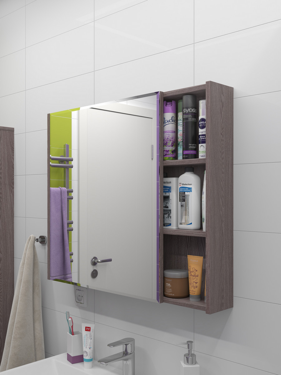 Шкаф зеркальный остоит из трех секций. Две открытые и одна за зеркальной дверью. Левое открывание. Петли с доводчиками. Зеркальное полотно с фацетом 10 мм.